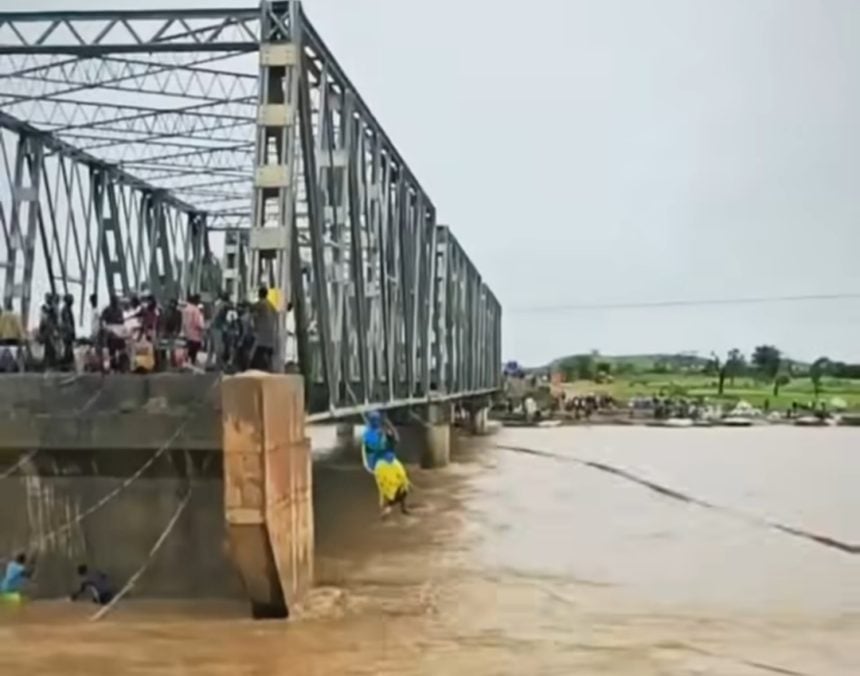A cikin faifan bidiyon, za a iya ganin wata mata ta rike igiya da karfi tana yawo, yayin da wasu mazaje ke shiga cikin kogin domin kwashe gangunan ajiyar karfe ta cikin ruwa.