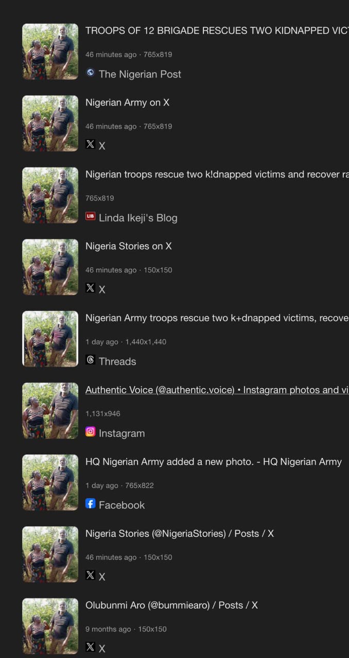 One of the image search results indicated that an X user identified as Olubunmi Aro (@bummiero) posted the picture nine months ago. Another result depicted that the Instagram handle of the Nigerian army posted the picture two years ago.