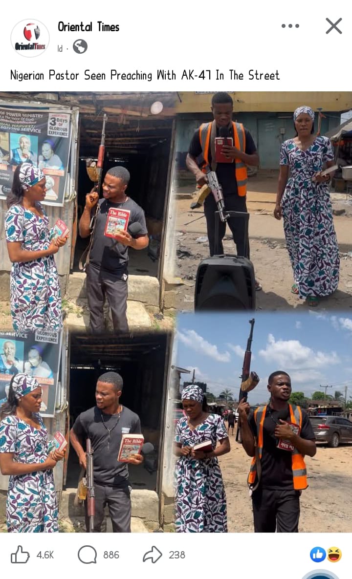 The picture was captioned: “Nigerian Pastor Seen Preaching With AK-47 In The Street”.