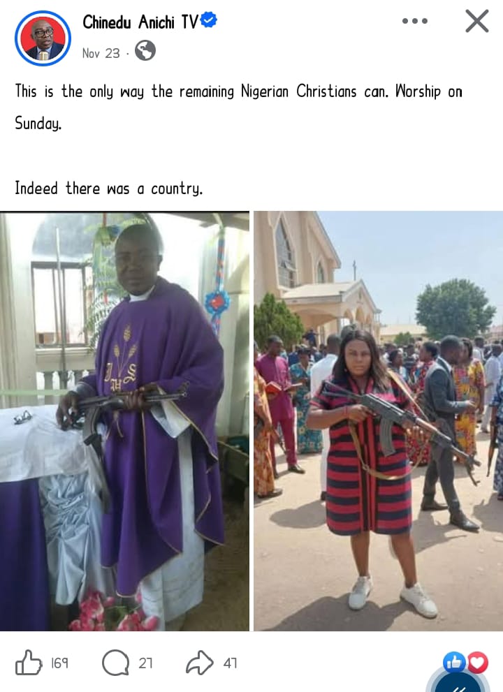 A Facebook page identified as Chinedu Anichi TV with over 88,000 followers posted the image alongside the caption: “This is the only way the remaining Nigerian Christians can. Worship on Sunday. Indeed there was a country”.