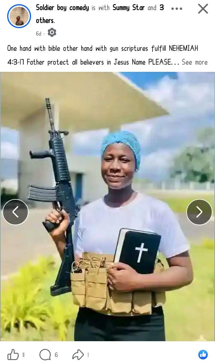 Another viral image of a woman holding a rifle and a Bible while wearing a security jacket was posted on Facebook with the caption “One hand with bible other hand with gun scriptures fulfill NEHEMIAH 4:3-17 Father protect all believers in Jesus Name PLEASE PRAY FOR BELIEVERS”.