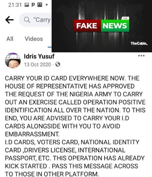 To verify the post, TheCable contacted Ben Akalu, spokesman of the house of representatives. He said the green chamber did not approve a request by the army to demand ID cards from Nigerians.