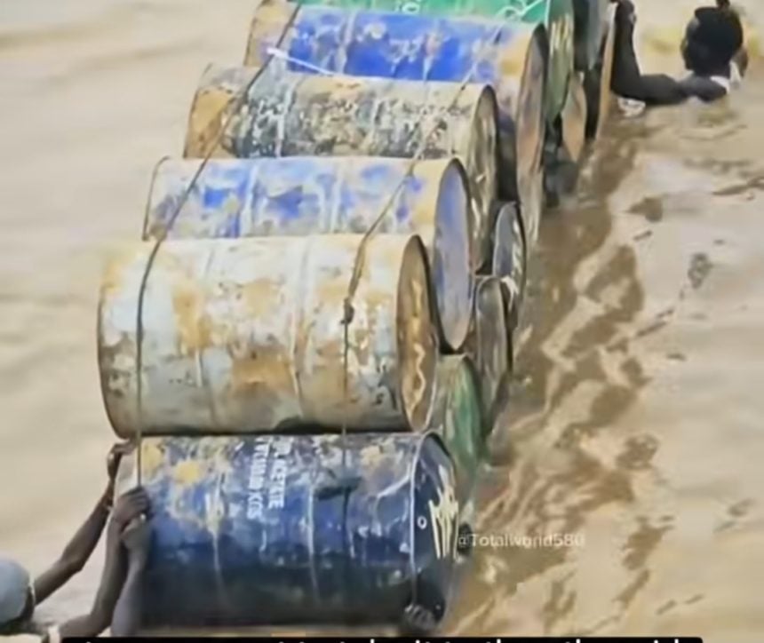 For the video, e get one woman wey dey hold the rope tight and dey use am dey cross, while some men enter water to carry steel storage drums through same water.